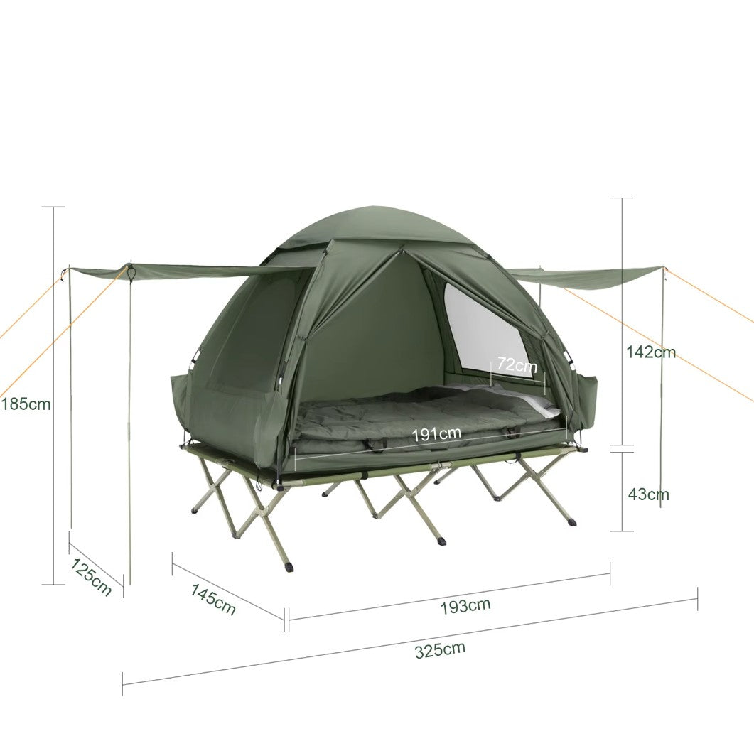 - Lit surélevé + tente + matelas gonflable + sac de couchage intégrés